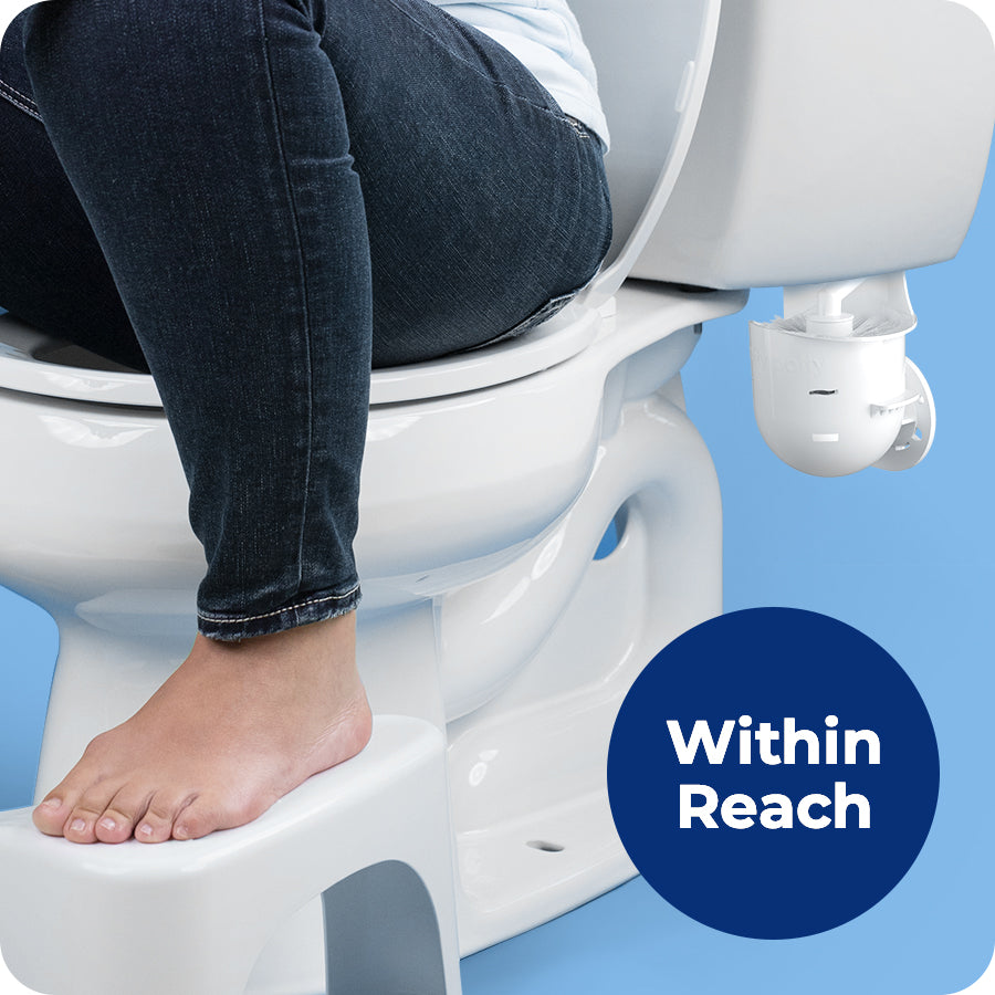 The brush caddy hangs the brush behind your toilet tank. Time to clean? Tilt the handle to quickly access the brush. Sweeping and mopping is easy since it doesn’t sit on the floor.