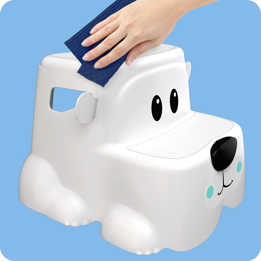 Squatty Potty toilet stools for kids are super easy to clean. Use a cloth or a damp cloth and your favorite cleaner. The surface is a durable plastic designed to support your child’s legs to make them feel safer and comfortable when using the toilet. It also helps them poop better!