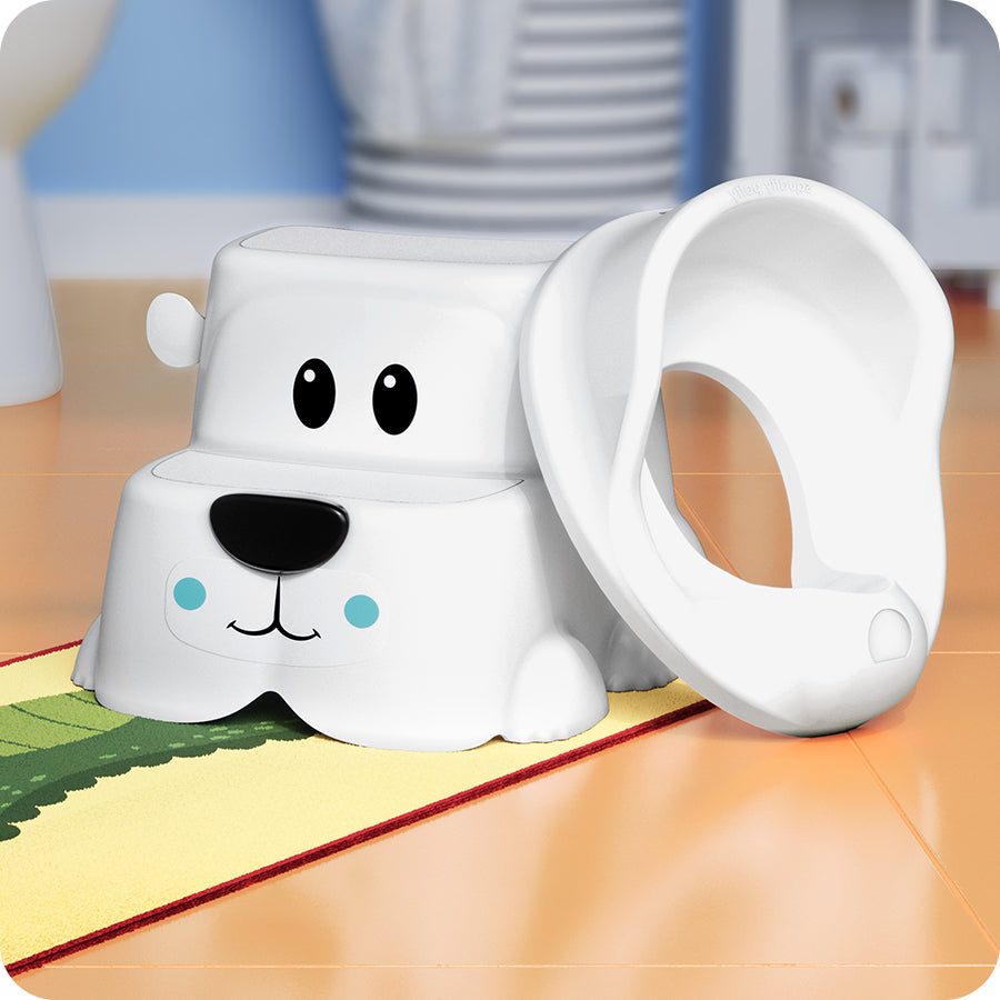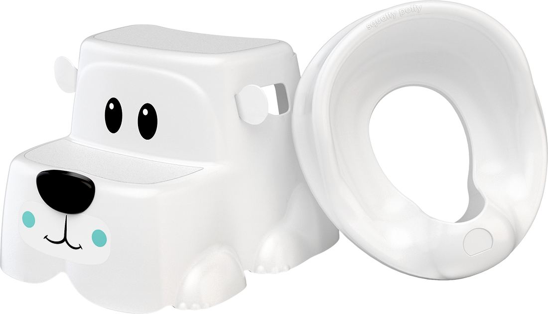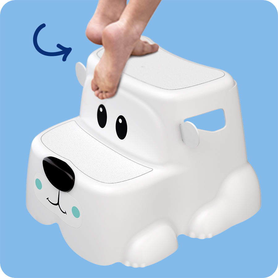 This happy white cub toilet stool is also a portable bathroom step stool. Kids can use it to reach the sink to wash their hands, clean their face, brush their teeth, or just stand tall like the big kids. This potty companion bear cub is ready to support your little one.