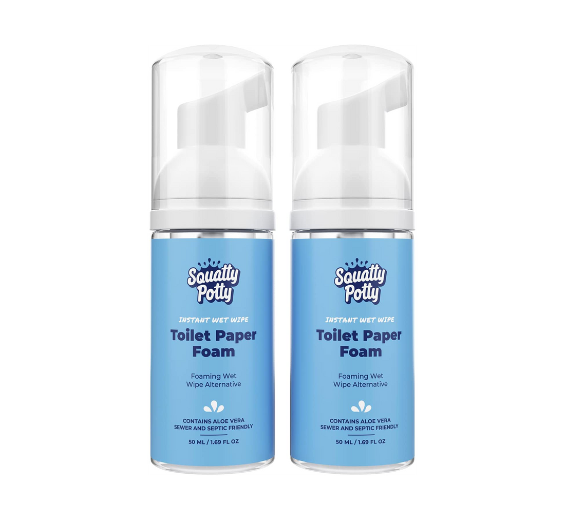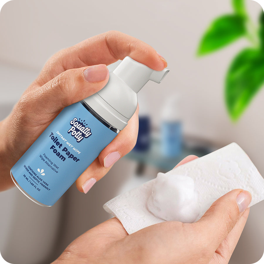 Turn your toilet paper into an instant wet wipe! Simply pump some Squatty Potty Toilet Paper Foam onto your favorite toilet paper and wipe! This foam is made with real aloe vera and allows for a soothing, clean wipe where you need it most. And since you are using it with your standard toilet paper, it is sewer and septic safe.